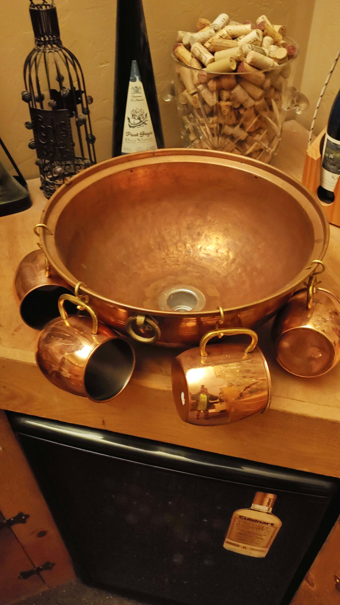 The wine chiller holds some 195 bottles of wine. The water dispenser supplies cold RO water. In the corner there is a small, glass door refrigerator for beverages. The copper sink is designed to be an ice bowl with drain.
