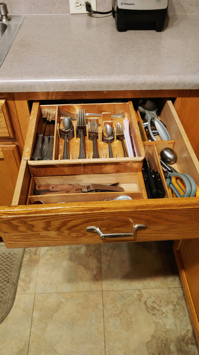 To resolve this, I built and angled drawer and slide. Now, you can properly pull the drawer out for access.
