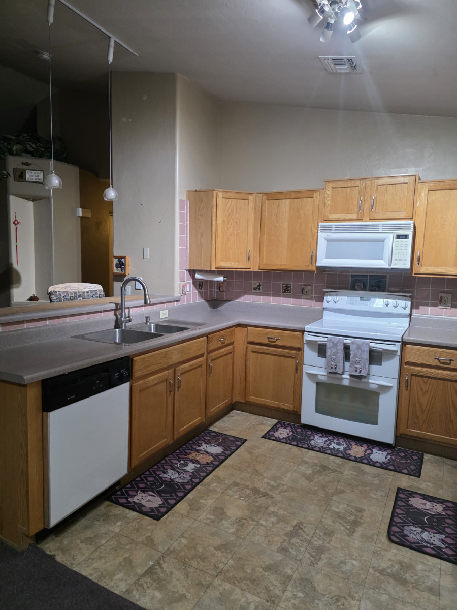 The kitchen is 10’x9′ (90sqft) with a 10’x9′ dining area. It has a dishwasher, 2 gang sink with garbage disposal, dual oven 5 burner ceramic top electric range, microwave and side-by-side Refrigerator/Freezer.
