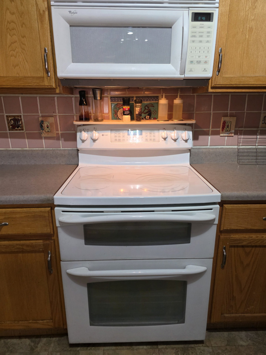 The kitchen is 10’x9′ (90sqft) with a 10’x9′ dining area. It has a dishwasher, 2 gang sink with garbage disposal, dual oven 5 burner ceramic top electric range, microwave and side-by-side Refrigerator/Freezer.