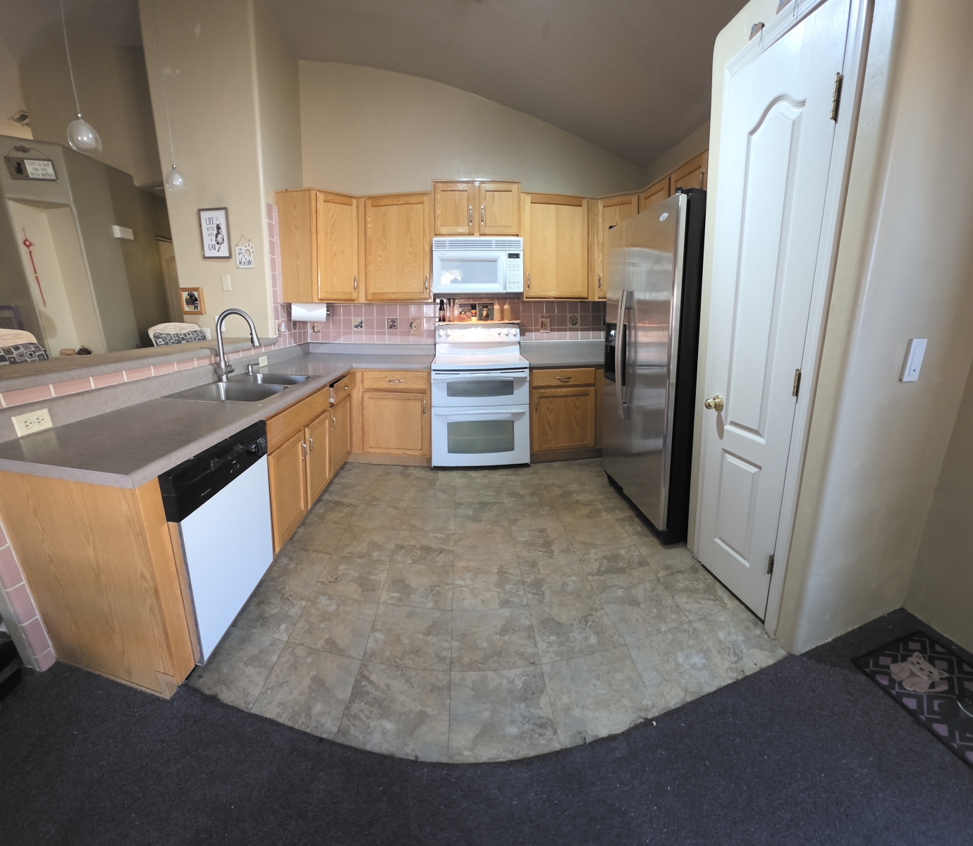 The kitchen is 10’x9′ (90sqft) with a 10’x9′ dining area. It has a dishwasher, 2 gang sink with garbage disposal, dual oven 5 burner ceramic top electric range, microwave and side-by-side Refrigerator/Freezer.