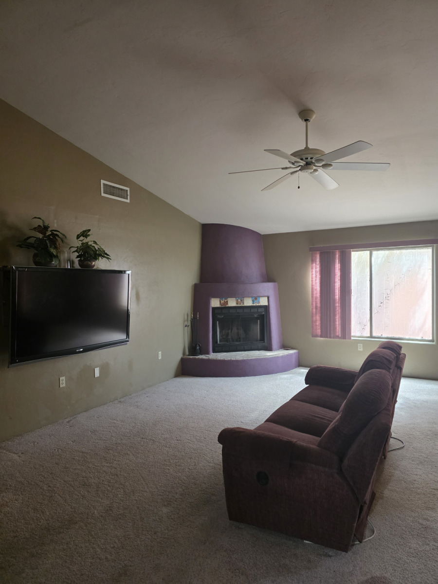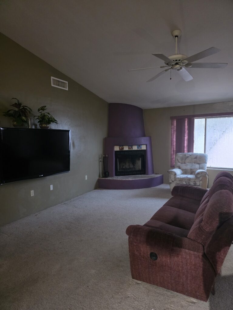 The open area is about 24’x13′. The extra room (behind sofa) we transformed into the bar area. In the corner is the beehive fireplace with the front door in the opposite corner.