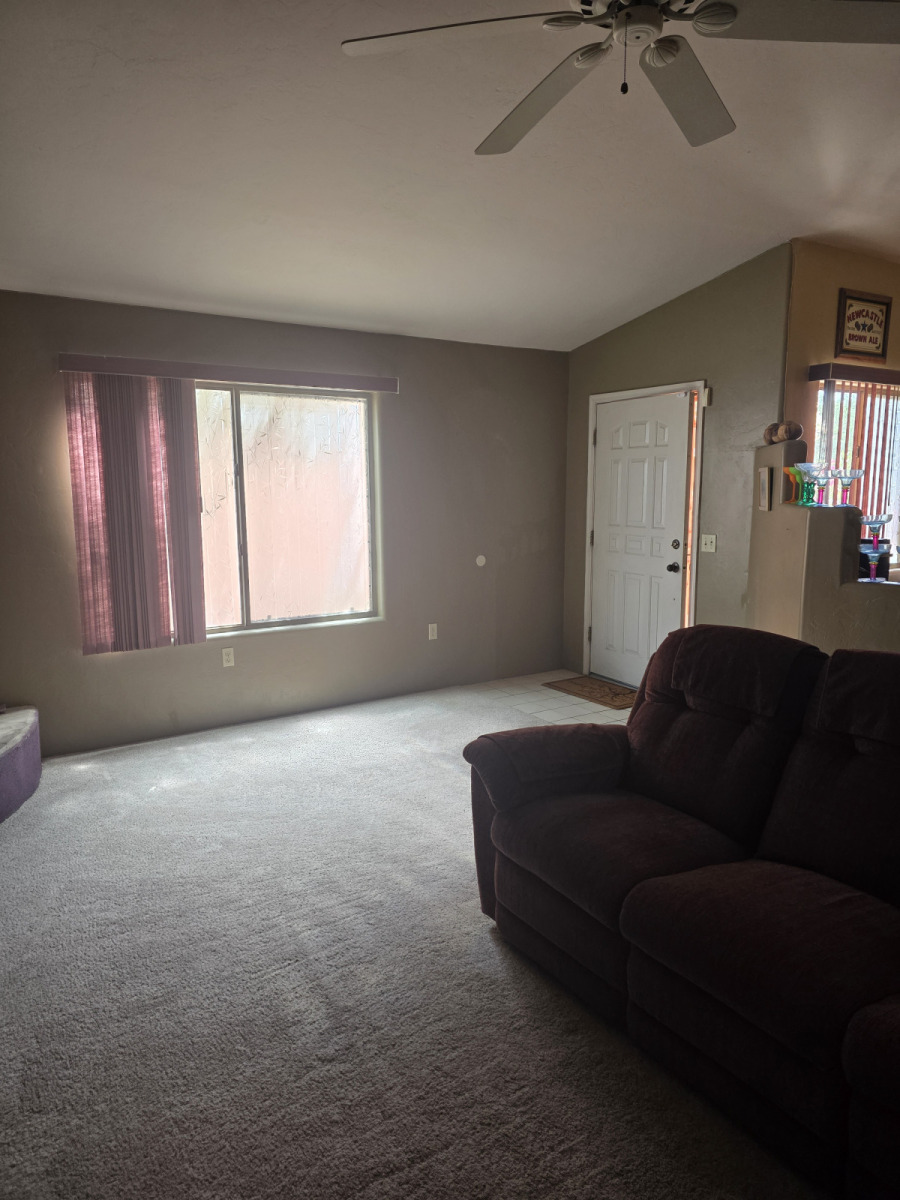 The open area is about 24’x13′. The extra room (behind sofa) we transformed into the bar area. In the corner is the beehive fireplace with the front door in the opposite corner.
