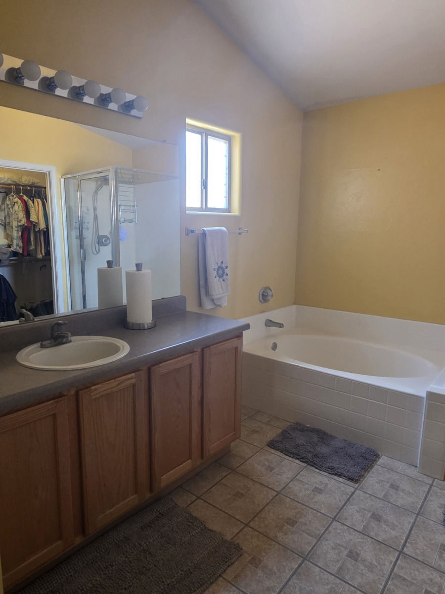 The master bathroom is 10×9 and has a 4×7 walk-in closet. There is both a tub and walk-in shower. I recently replaced the mixing valve in the shower so it should be good to go. See the Floor Plan for more info.