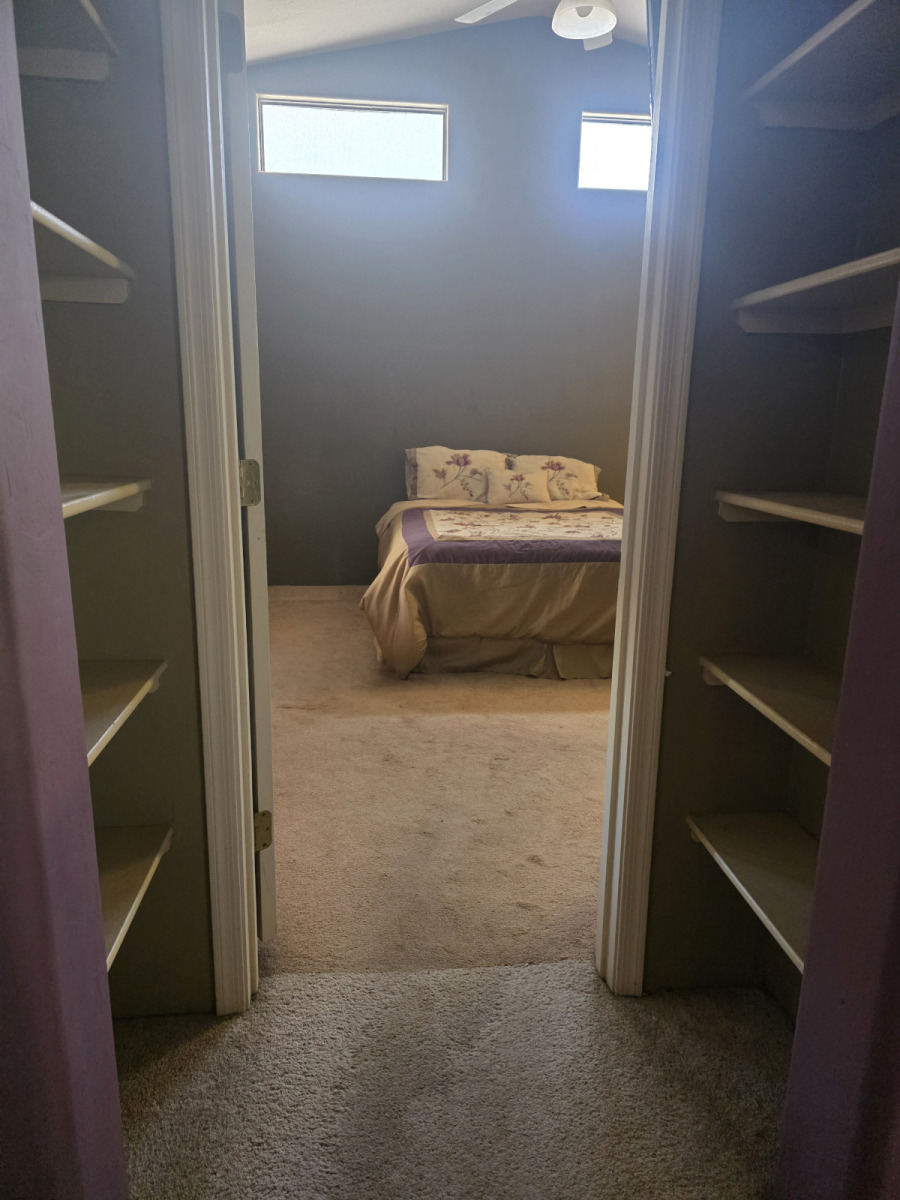 The master bedroom is 16×13, with vaulted ceiling. There is a hanging lighted ceiling fan.