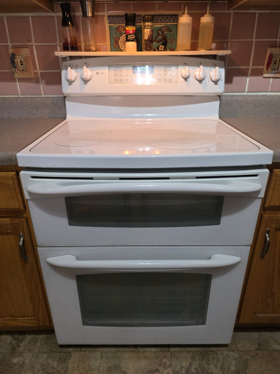 The range is an electric GE Profile Dual Oven, 6 element ceramic top model. It is very clean, inside and out. I built an easy to remove and clean upper shelf, as this model has a curved control panel. Not very practical in my book.