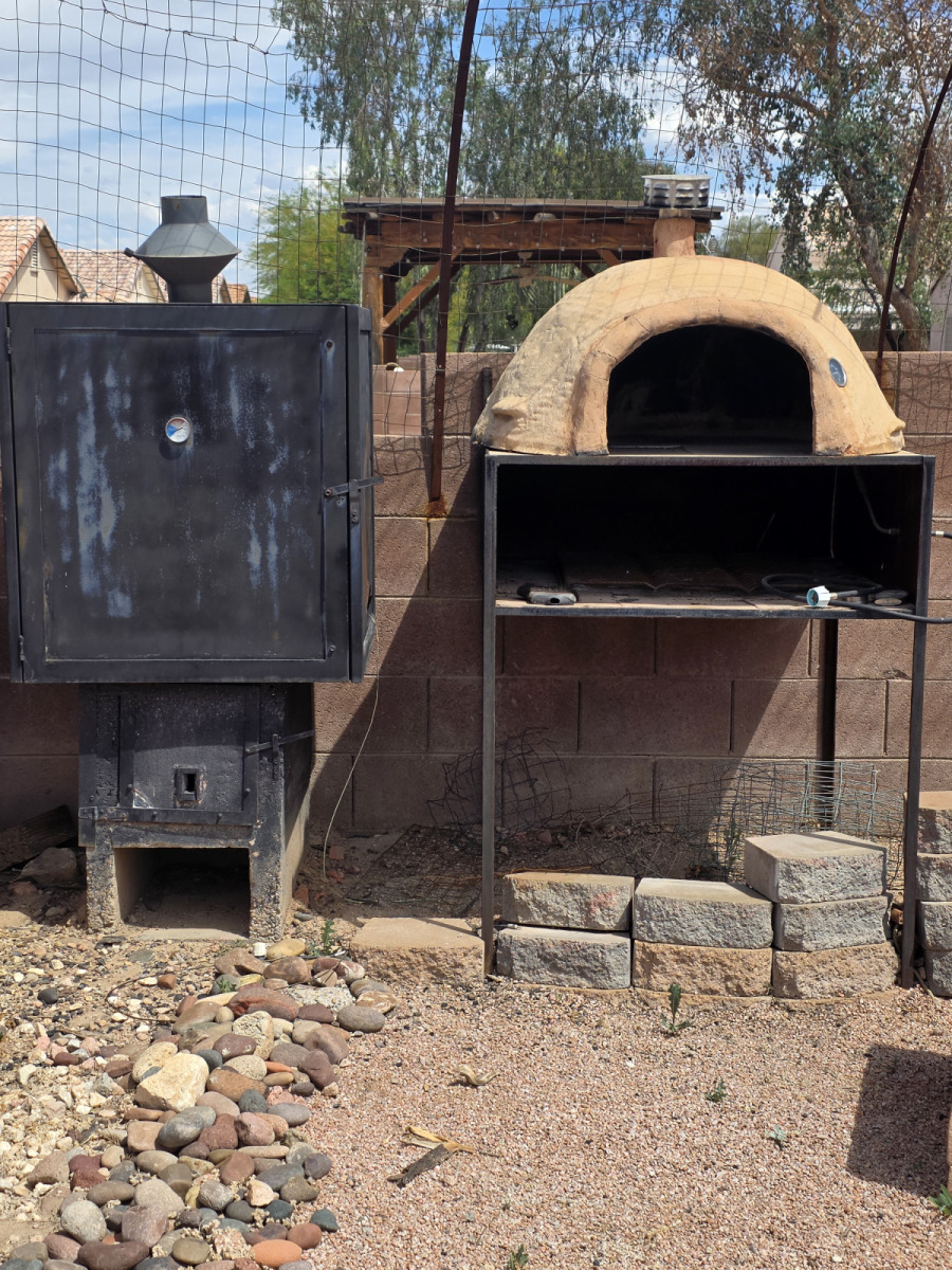 Beside the smoker is my 34″ pizza oven. It is a unique design as the below the oven is a fire box. This accomplishes two things, it quickly heats the floor of the oven and provides lots of smoke. Then once you have the bottom hot, you can start a fire inside the oven to finish off the pizza. I added a propane touch to the inside to help as one would go through a lot of wood and time to make single pizza. I will be happy to leave these two smokers as part of the deal if requested.